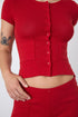 The Marie Polo Top is a fitted knit top with a short sleeve and scoop neckline. It features a button-down front and delicate pointelle flower detailing at the waist. Finished in a soft cotton blend with a slightly cropped length.