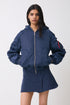 Finished with flight-jacket-inspired details, including a zip pocket on the right arm and ruched front zip pockets and red lining.