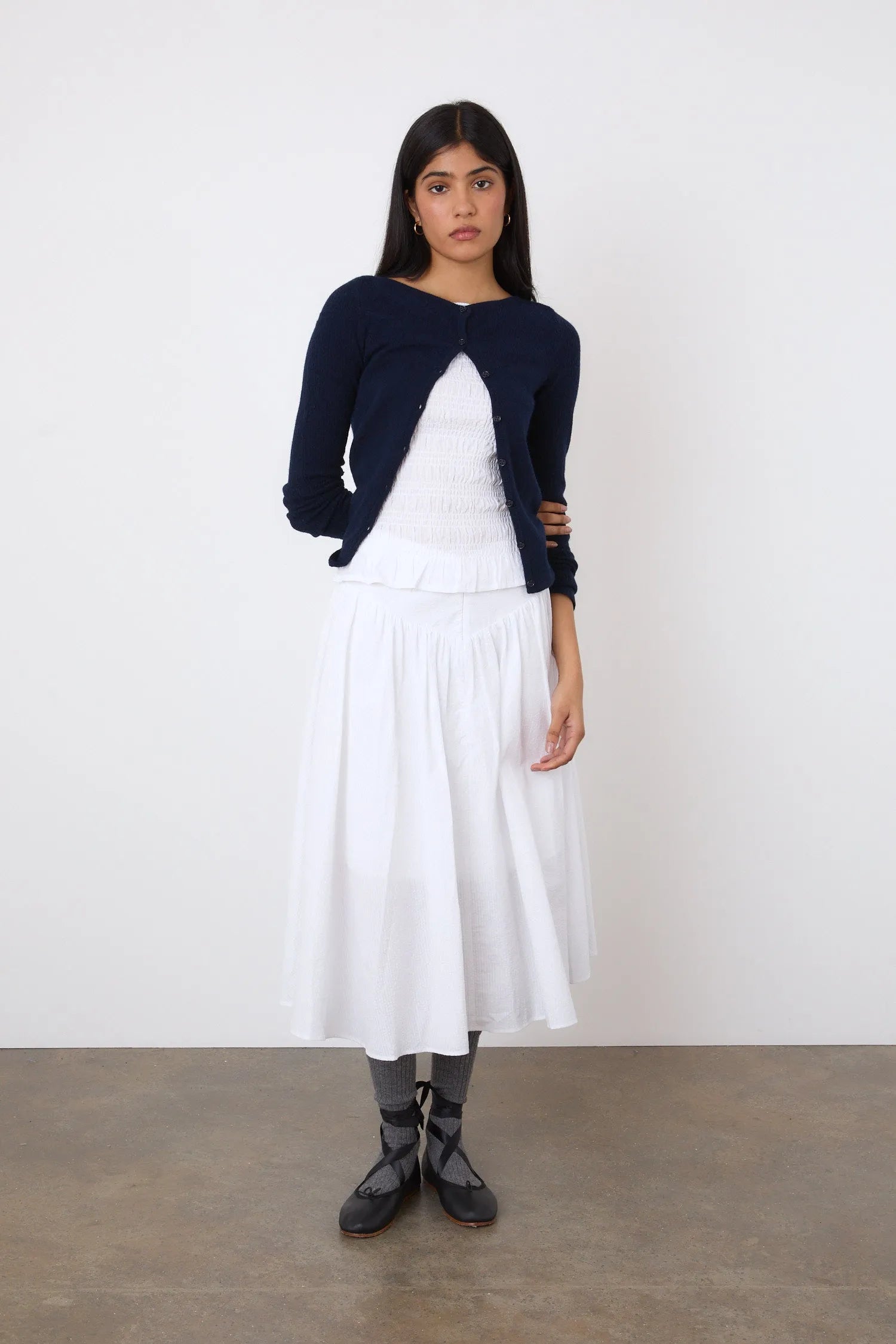 Mid-rise midi with a deep v-shaped waistband complete with invisible front zip closure that leads into a gathered midi, creating the perfect floaty a-line fit. Made from a new 100% cotton fabrication with a subtle slubby seersucker stripe.