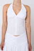 The Dylan Halter Top is a fitted top cut in broderie cotton. It features a plunge neckline, open back, and structured bodice with front seam detailing. Fastens with a concealed zip at the back for a smooth fit and features double lined cups for coverage.