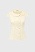 Fitted cap sleeve blouse with an asymmetric curved wide collar.